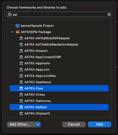 * Select `AATKit-Core` and all ad networks you want by selecting `AATKit-<AD_NETWORK>` (Replace <`AD_NETWORK`> with the proper Ad Network) like the following: